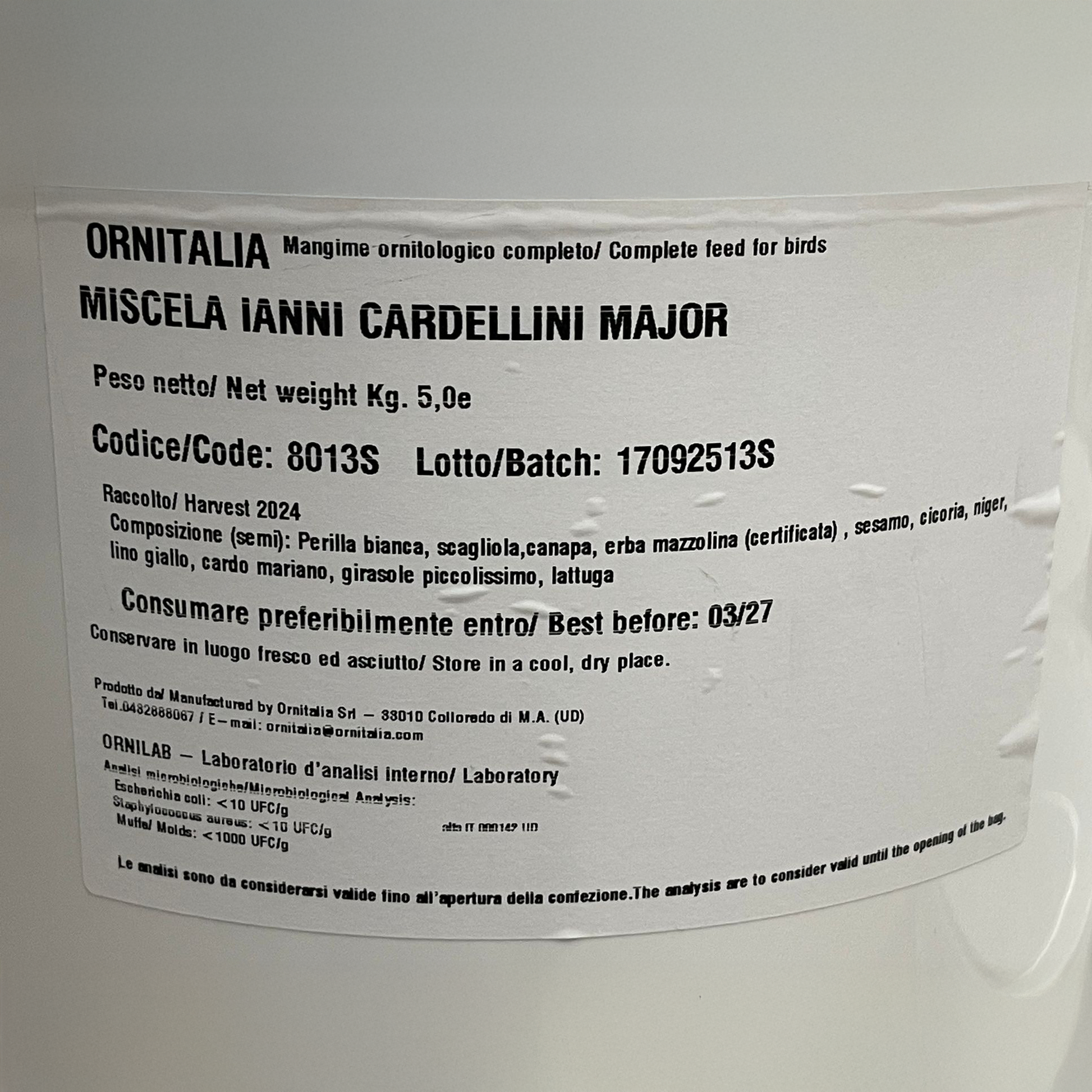 Composizione (semi): Perilla bianca, scagliola, canapa, erba mazzolina (certificata), sesamo, cicoria, lino giallo, cardo mariano, girasole piccolissimo, lattuga
